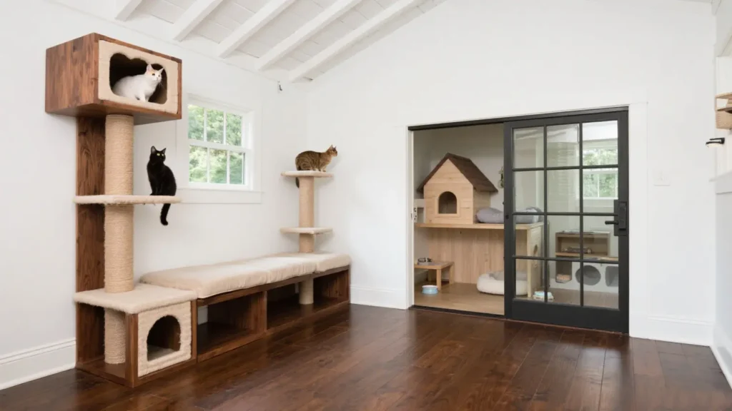 Safety checks are also essential. Secure cords, lock away cleaning agents, remove toxic plants like lilies that are deadly to cats, and install window guards to create a fully safe environment for the cat. Generally, let the cat stay here for 2–3 days, or wait until they start eating normally and using the litter box before expanding their exploration range.