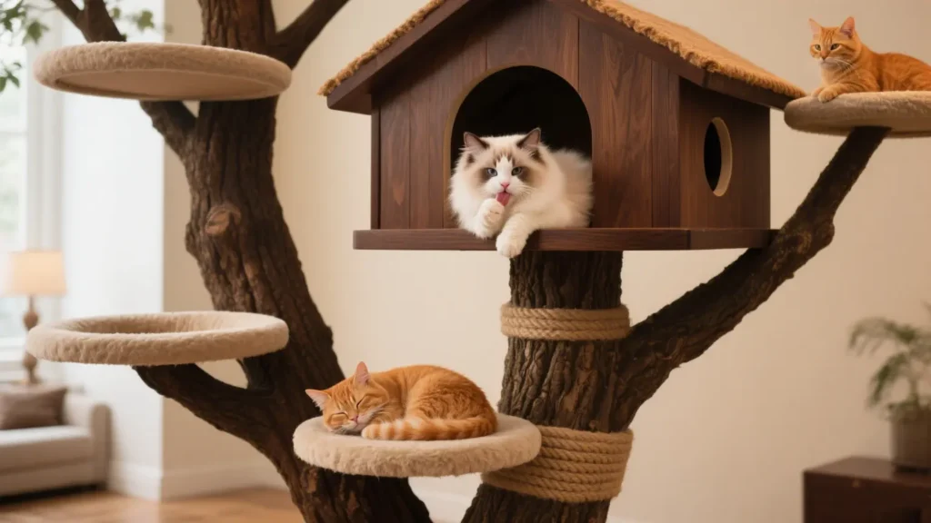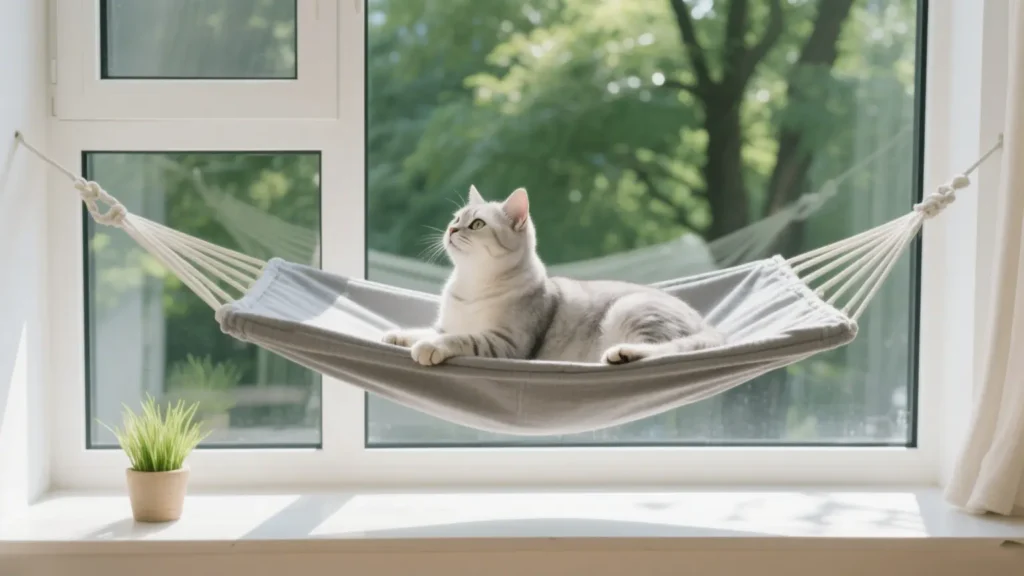 Visually, placing a cat hammock or climbing frame near a window, paired with a bird feeder for cats to observe birds; a “cat TV” displaying images of fish or insects can also capture attention; if feasible, set up a small covered fish tank.